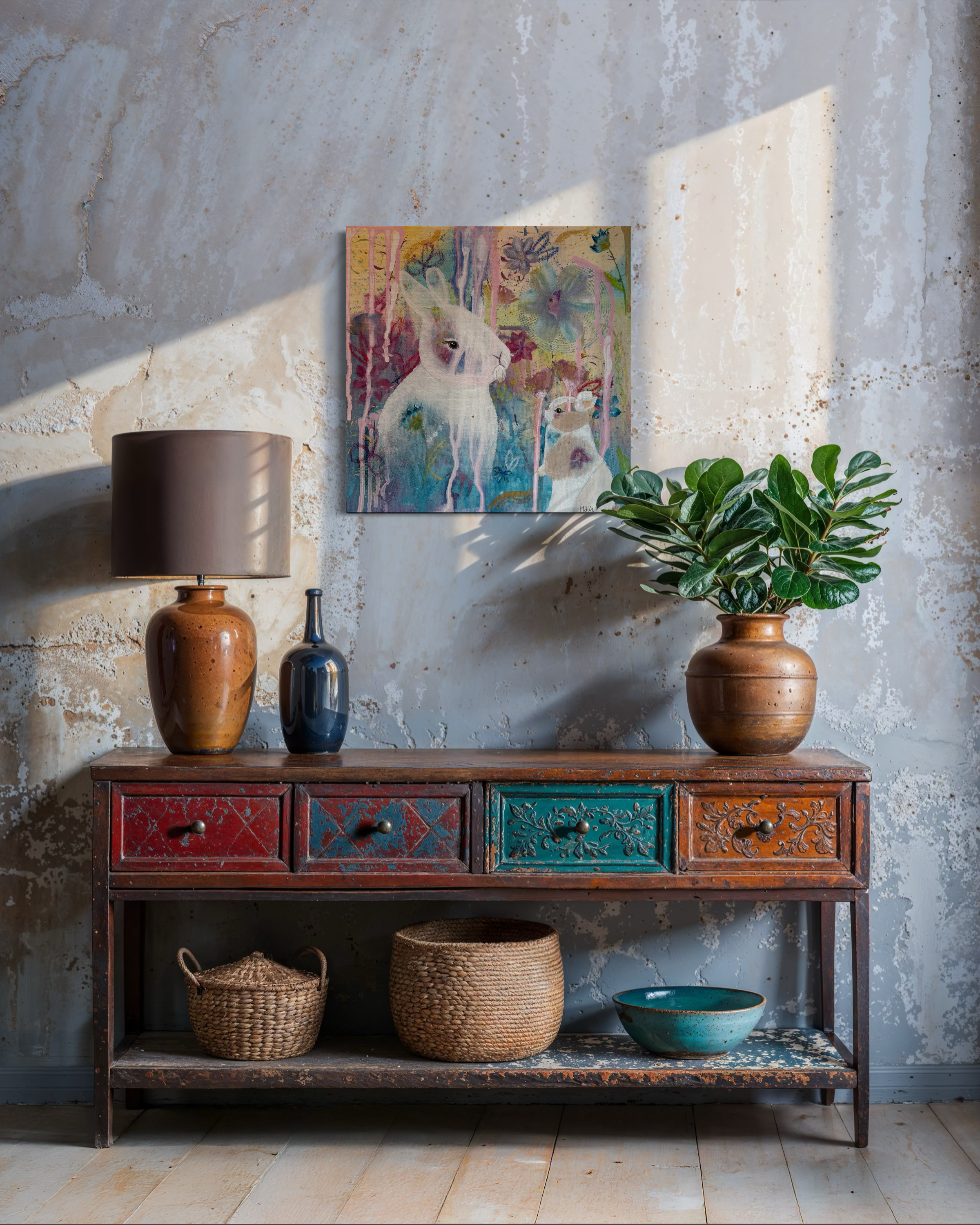 Jeg skaper lys, glede og undring gjennom fargerike bakgrunner og lekne, fantasifulle uttrykk. Kunst som løfter humøret, varmer rommet og inviterer deg inn i et lite eventyr hver gang du ser på det.